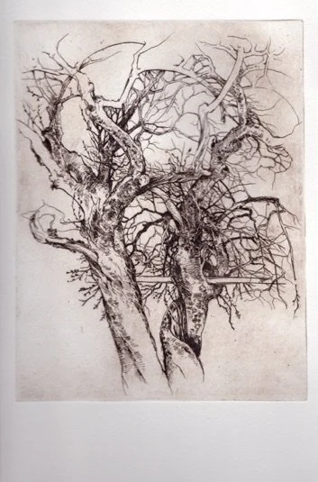 “Twin Apples” and “Aging Trees” were both aging apple trees drawn in small backyard orchards in the Sumava region of southern Bohemia - inscribed into copper plates during my wandering about this mountainous backwater, as I was getting to know Jana, my wife to be, and where she was from. Something about the aging trees in an extended village structure scattered up through the valleys from the fertile bottoms and thinning out into woodlands up topside as it neared the Bavarian border seem to sum it all up - Germans just over the hill - our people on this side. They have of course all been abused by the centralized powers and been smugglers on both sides of this tenuous divide.
